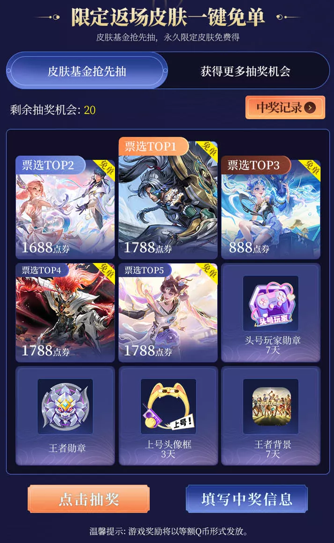 最让召唤师们期待的限定返场皮肤环节来啦!本次活动开启限定返场皮肤一键免单通道,皮肤基金抢先抽,热门皮肤轻松入手不是梦!奖池阵容堪称豪华,票选TOP1、TOP4、TOP5的1788点券高价值皮肤强势返场,还有TOP2的1688点券皮肤、TOP3的888点券皮肤等你来抽,无论是颜值担当还是战力神器,总有一款是你的心头好!