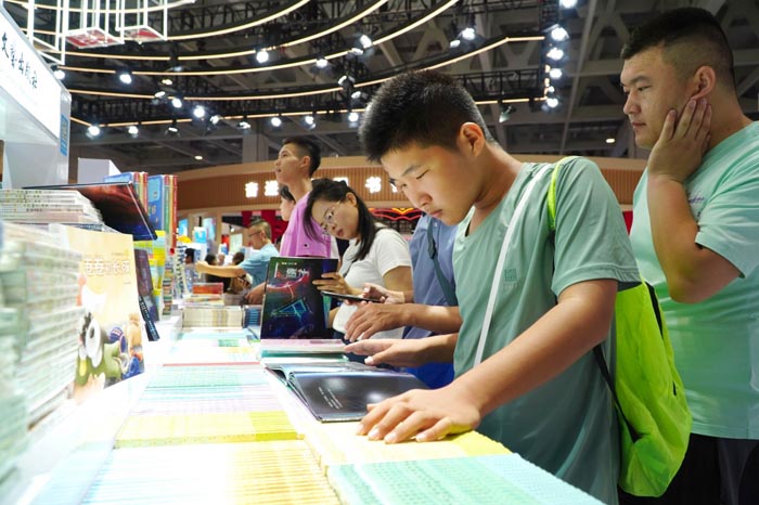 7月27日,在第31届全国图书交易博览会上,读者在阅览新书。 新华社记者徐速绘 摄