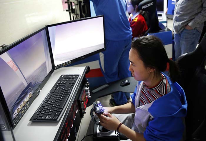 4月11日,一名中学生在参加模拟飞行舱体验。