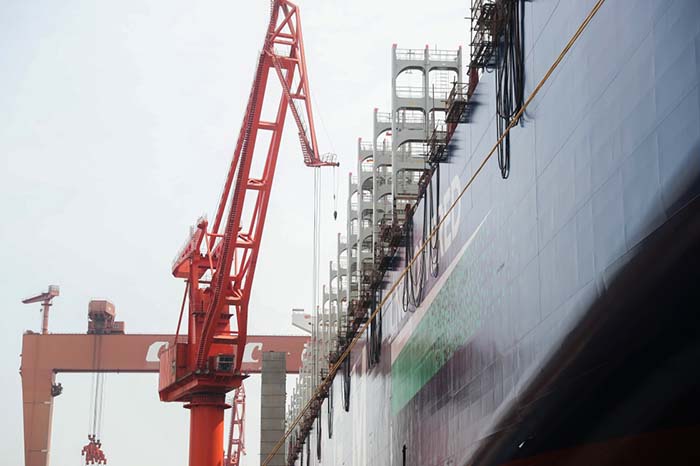 4月26日拍摄的中国船舶集团旗下江南造船3号船坞内的23000箱集装箱船。 新华社记者丁汀 摄