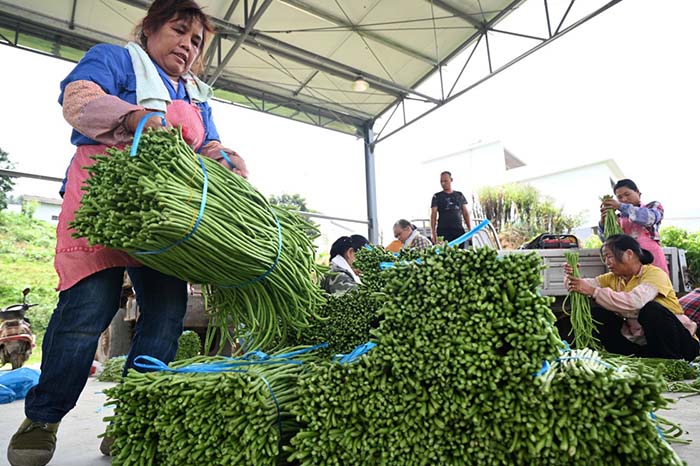 9月20日,在广西柳州市鱼峰区白沙镇王眉村,村民把刚采摘的豆角分拣打包。 新华社发(黎寒池 摄)
