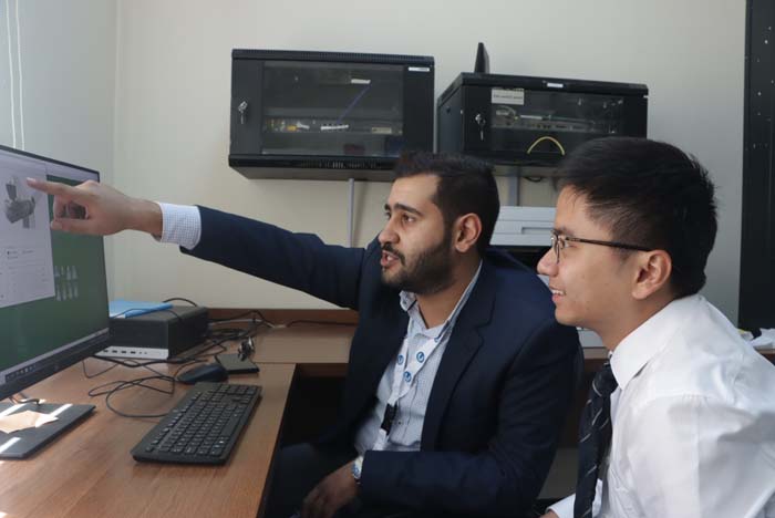 9月19日,在约旦舒巴克风电站,三峡国际约旦新能源项目工程师江崧玮(右)与舒巴克风电站现场运维工程师奈扎尔·阿勒胡沙曼交流工作。 新华社记者冀泽 摄
