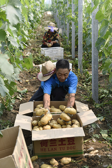7月7日,山东省邹平县长山镇八方农场外包的农业公司工人在葡萄间作地里收获土豆。