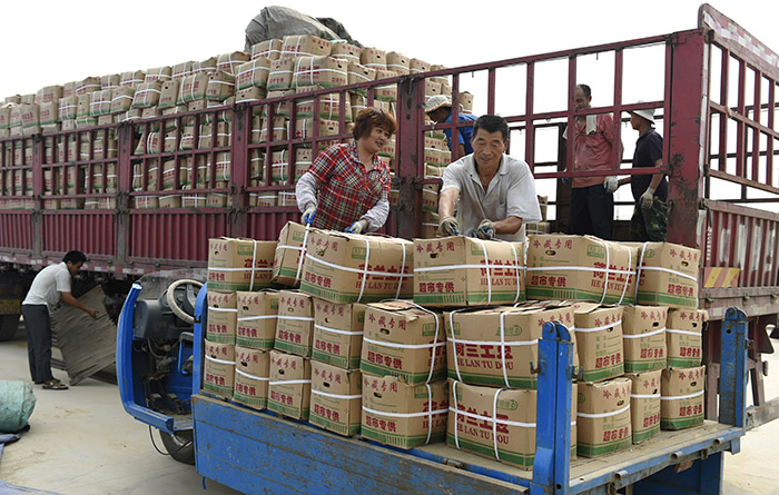 7月7日,山东省邹平县长山镇八方农场外包的农业公司工人把收获的土豆装车外运到广东销售。