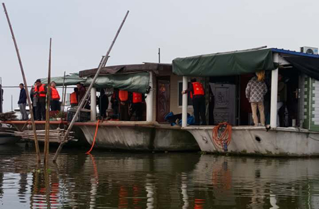 王云军和其他1500户渔民一样,全家居住在水泥船上,这里就是他们家。在水泥船旁边还有一艘打渔船,是作为平时的代步工具来使用的。水泥船临着的水域,是用竹竿围起来的自家的20亩水面,这20亩水面就是一家人的主要经济来源。