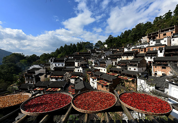 10月15日,江西省婺源县江湾镇篁岭村村民在房前屋后晾晒收获的农产品。  新华社发(胡敦煌 摄)