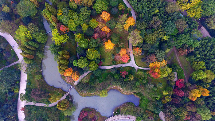 11月13日,从空中俯瞰,扬州瘦西湖万花园色彩斑斓。 新华社发(孟德龙 摄)