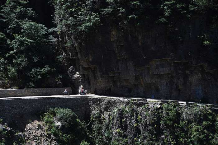 两名下庄村村民骑着摩托车行驶在下庄村通往外界的公路上(6月7日摄)。 新华社记者王全超 摄