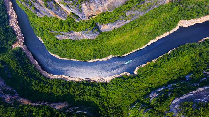 巫山小三峡的滴翠峡内,一艘游船满载着游客在美丽的山水间前行(6月29日摄)。 新华社记者刘潺 摄