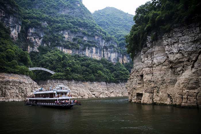 巫山小三峡的滴翠峡内,游船上的游客在欣赏绝美的峡谷风光(6月29日摄)。 新华社记者刘潺 摄