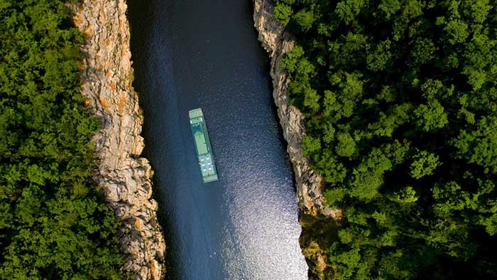 巫山小三峡的滴翠峡内,一艘游船满载着游客在美丽的山水间前行(6月29日摄)。 新华社记者刘潺 摄