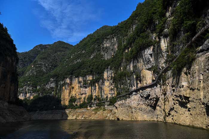 巫山小三峡的滴翠峡内,两岸的青山和绝壁上的仿古栈道相映成趣(6月29日摄)。 新华社记者刘潺 摄