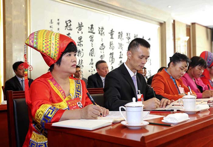 2017年10月19日,党的十九大代表、广西南宁市第四人民医院艾滋病科护士长杜丽群(前排左一)参加广西壮族自治区代表团讨论。她希望加大对基层卫生事业投入,为县、乡配置先进的医疗设备,加强医联体协作,让群众在家门口享受到大医院的优质医疗服务。