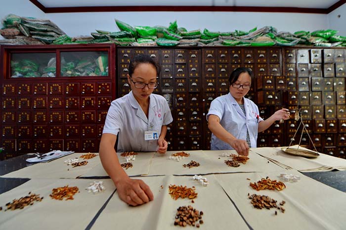 2017年8月25日,在河北省石家庄市藁城区廉州镇中心卫生院“国医堂”,医师在抓配中药。 新华社记者牟宇 摄