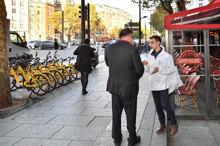 9月17日,巴黎大众运输公司的工作人员在法国巴黎“奥尔良门”车站附近派发传单宣传绿色出行。
