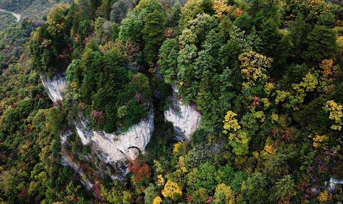 这是甘肃省陇南市两当县云屏三峡自然风景区秋景(10月18日无人机拍摄)。 新华社记者陈斌 摄