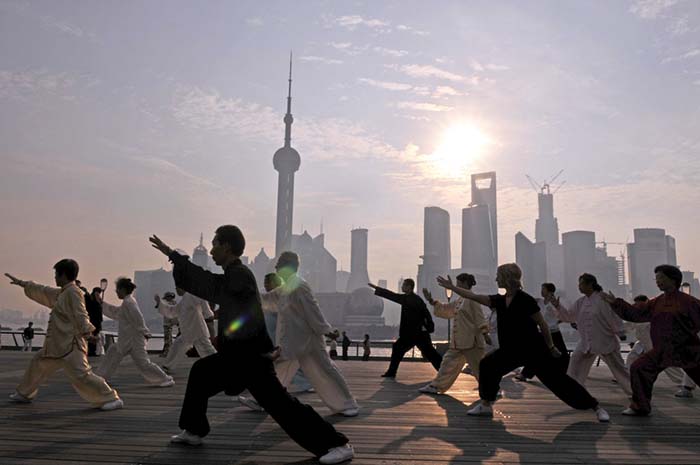 图为2012年10月3日清晨,上海市黄浦区外滩纪念塔太极拳辅导站的太极爱好者与游客,在上海外滩陈毅广场练习太极拳,强身健体,享受长假。 新华社发(潘华清 摄)