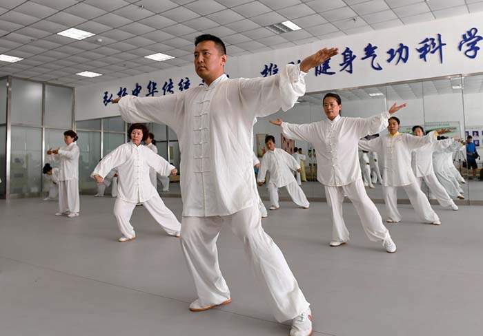 图为2017年7月15日,健身气功爱好者在满洲里馨园文体馆运动健身。步行5分钟,居民就能找到免费开放的体育设施或场馆。 新华社记者李俊东 摄