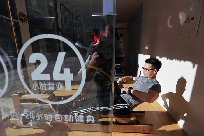 图为2018年4月2日,几位成都市民在成都时代晶座小区的健康仓内锻炼身体。该健康仓由集装箱改造而成,面积24平方米,24小时开放,扫二维码按次收费。仓内除了提供基本的健身器材以外,还有空气净化器、空调、饮水机等设备,让市民在社区里可以自由方便地健身。 新华社记者江宏景 摄