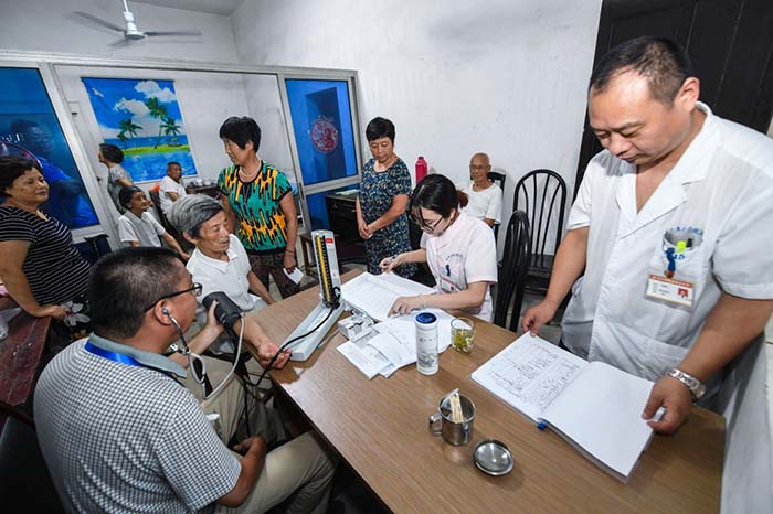 浙江省长兴县夹浦镇卫生院医生在环沉村一户村民家中设立临时巡诊点,为村民进行免费身体检查(2017年8月3日摄)。 新华社记者徐昱 摄