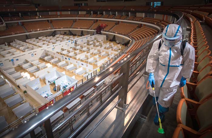 3月8日,来自河南安阳的志愿者柴晓伟在进行消杀作业。 新华社记者肖艺九 摄