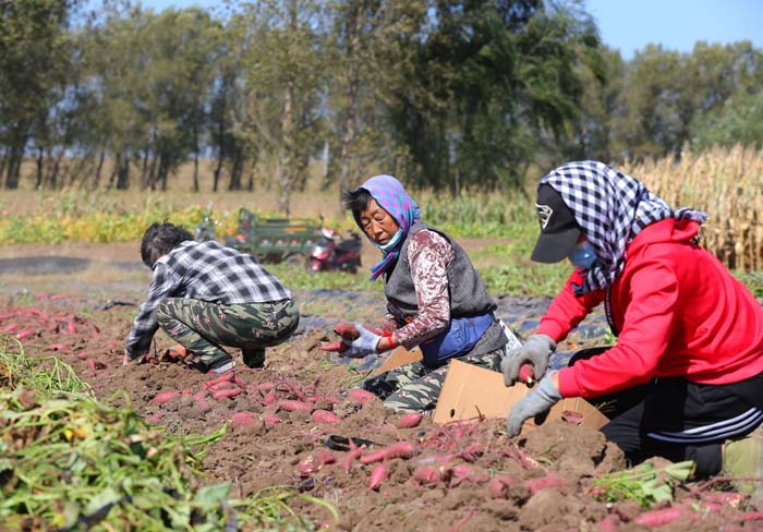 9月21日,在康平县方家屯镇十家子村,农民在地里收获红薯。 新华社记者杨青 摄