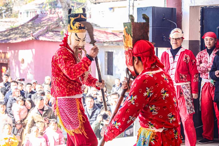 1月29日,在江西省抚州市南丰县莱溪乡黄满村,傩舞艺人在表演傩舞。 新华社发(袁智 摄)