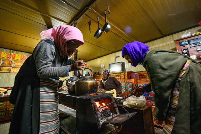 在西藏当雄县纳木湖乡达布村的冬季放牧点,云丹的妻子同吉(右)和朋友芝嘎措姆在烧水(11月10日摄)。 新华社记者晋美多吉 摄