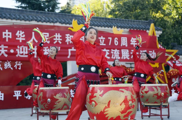 9月25日,在河南省洛阳市汝阳县刘伶广场,汝阳县牡丹艺术团在表演音乐鼓《中华魂》。新华社发(康红军 摄)