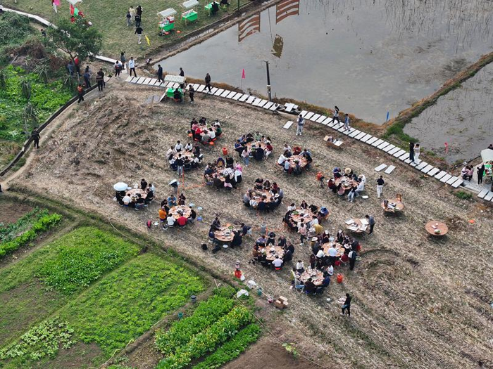 游客在柳州市柳江区百朋镇百朋村“酒壶山人家”集市体验田园火锅(1月17日摄,无人机照片)。新华社发(郑昌昊 摄)
