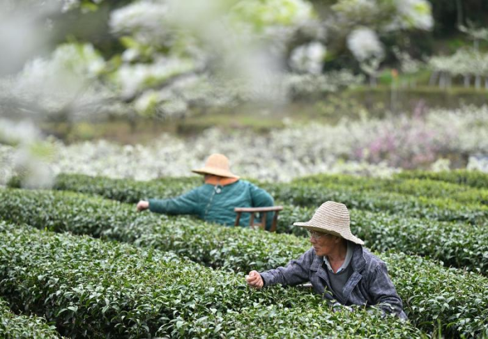 3月27日,湖北省宣恩县椒园镇黄坪村农民在梨茶套种的田间采摘明前茶。新华社发(宋文摄)