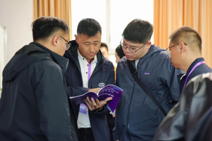 4月25日,选手在现场讨论中式八球团体邀请赛比赛手册内容。