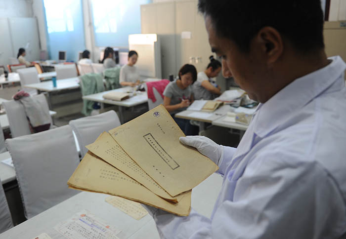 8月12日,黑龙江省档案馆工作人员整理日伪时期进入黑龙江地区的日本移民档案。