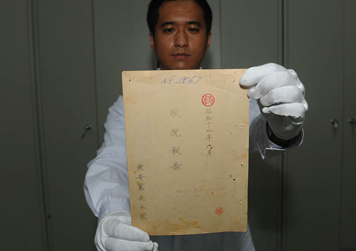 在中国人民抗日战争暨世界反法西斯战争胜利70周年纪念日到来之际,黑龙江省档案馆公布了最新发掘整理的一批侵华日军遗留档案,内容涉及日本移民侵略黑龙江、强征“慰安妇”、向七三一部队“特殊输送”三大板块,其中一部分系首次对外公布。这些档案具有极高的史证价值,为揭露侵华日军罪恶行径提供了铁证。 新华社记者王松 摄