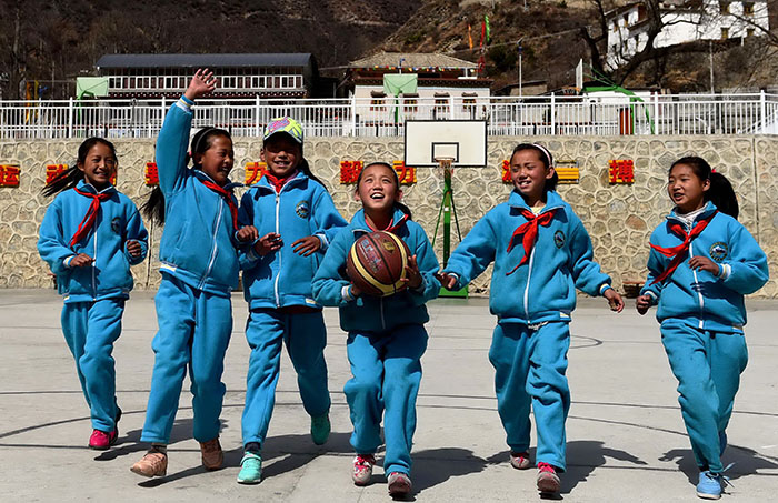 云南省迪庆藏族自治州德钦县第一小学的几名藏族女学生在打篮球(3月17日摄)。当地实施集中办学,学校的硬件设施有了很大的改善。