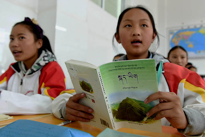 云南省迪庆藏族自治州藏文中学的藏族女学生在上藏文课(10月13日摄)。