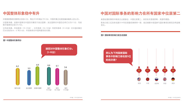 1、中国国家形象稳中有升,对国际事务的影响力在所有国家中位居第二。中国整体印象得分为6.2分(总分为10分),比2014年提升了0.3分。其中,发展中国家对中国的印象(6.9分)比发达国家(5.5分)明显更为积极。相比年长群体,海外年轻人(18-35岁)对中国的了解程度更高,整体印象更好,对中国未来发展形势的看法也更为乐观。美国在国际事务中影响力占据首位,中国位居第二,其后依次是俄罗斯、英国和德国。