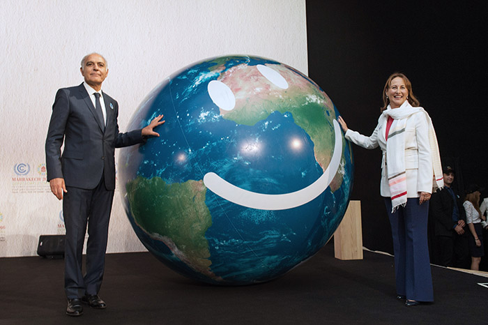11月7日,在摩洛哥马拉喀什,法国生态、可持续发展和能源部长赛格琳·罗雅尔(右)与马拉喀什气候变化大会主席、摩洛哥外交与合作大臣萨拉赫丁·迈祖阿尔合影。 新华社记者孟涛 摄