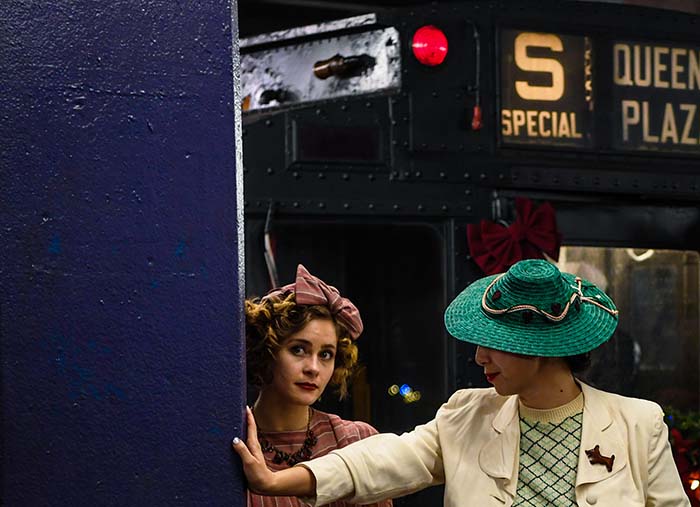 开往过去 12月18日,在美国纽约市,穿戴旧时服饰的女子站在“怀旧地铁”专列前。