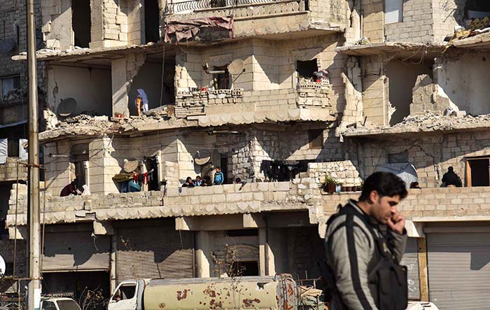 收复 12月19日,在叙利亚北部城市阿勒颇,当地居民在阳台上观看反政府武装撤离阿勒颇市。