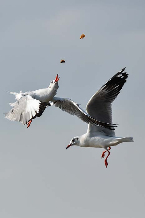 赏鸥 12月20日,在泰国中部北榄府邦布,两只棕头鸥在半空中接食游客投喂的饵料。