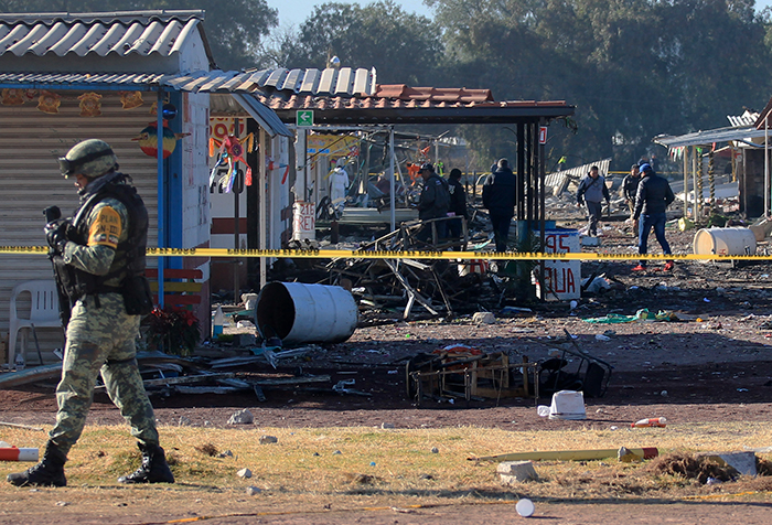 爆炸现场 12月21日,在墨西哥图尔特佩克市,一名士兵在烟花市场爆炸事故现场巡逻。