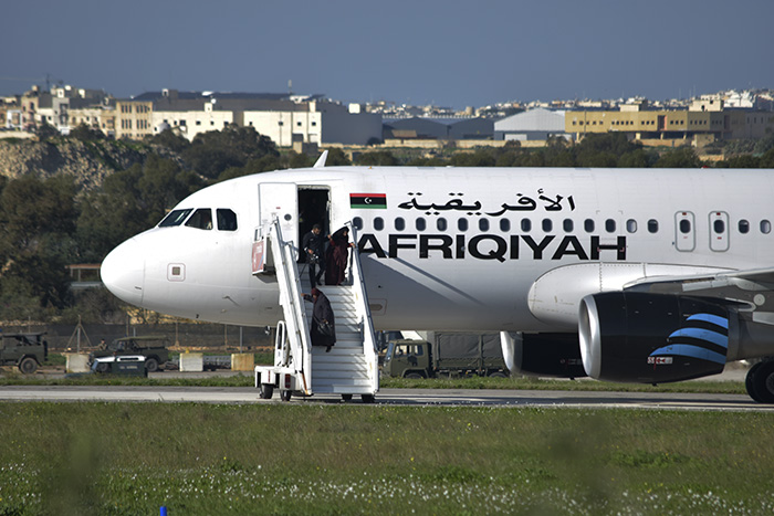 一架载有118人的利比亚客机23日遭劫持后在马耳他国际机场降落,包括乘客和机组人员在内的116人不久后获释,两名劫机者投降。 新华社发(马克·扎米特·科迪纳 摄)