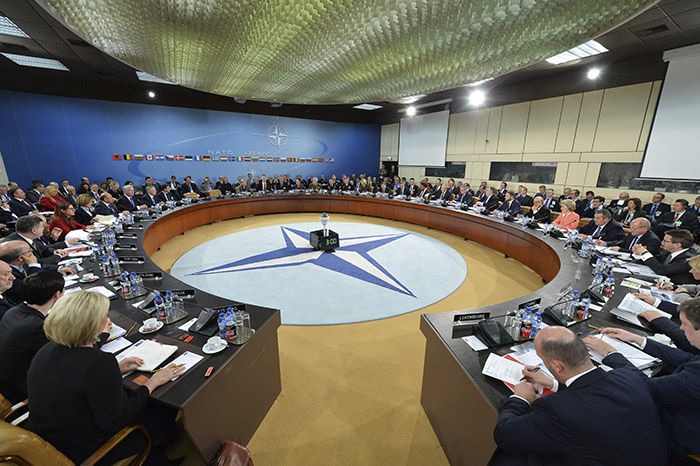 这张北约提供的照片显示的是在位于比利时布鲁塞尔北约总部拍摄的北约防长会会场(2月15日摄)。