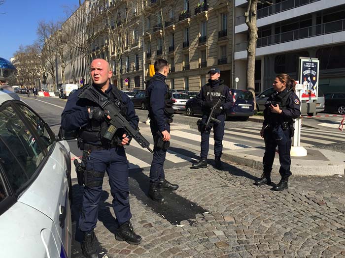 3月16日,在法国巴黎,警察在国际货币基金组织驻巴黎办事处大楼外警戒。 新华社记者韩冰 摄