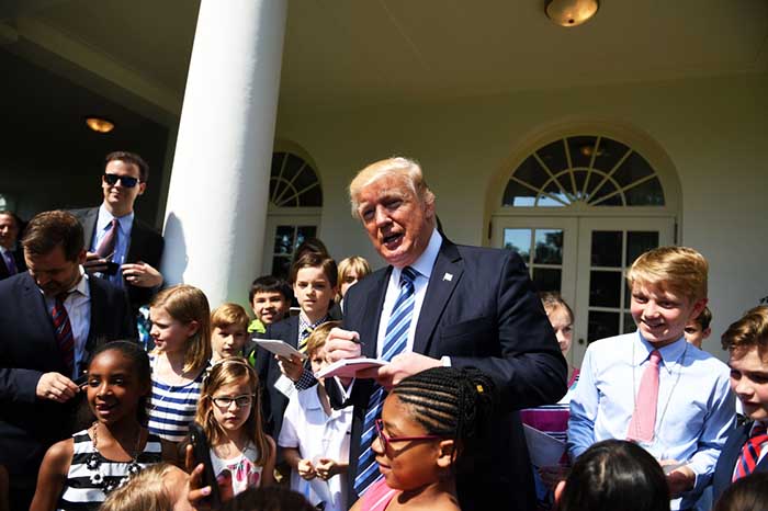 4月27日,在美国华盛顿白宫玫瑰园,美国总统特朗普(中)给参加活动的孩子们签名。 新华社记者殷博古 摄