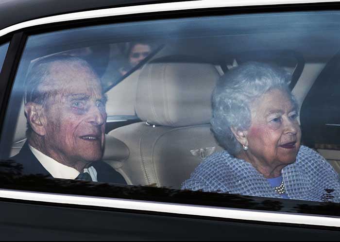 5月4日,在英国伦敦,英国女王伊丽莎白二世(右)与丈夫菲利普亲王乘车返回白金汉宫。