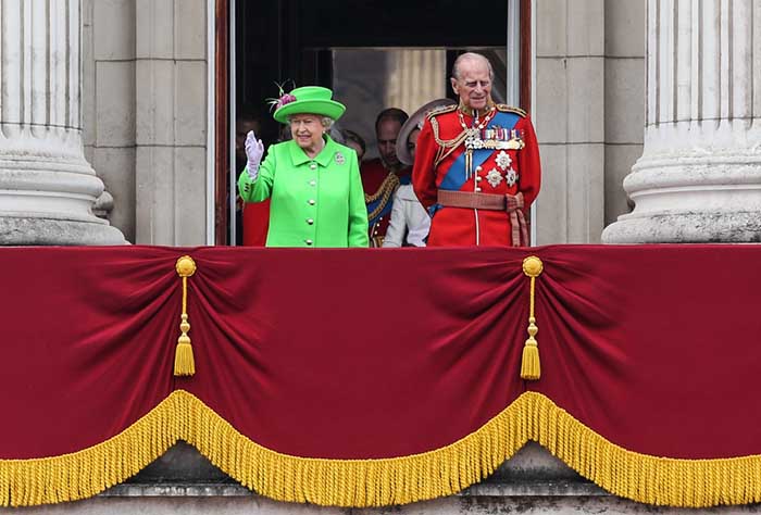 这是2016年6月11日,在英国伦敦白金汉宫的阳台上,英国女王伊丽莎白二世(左)与丈夫菲利普亲王观看阅兵式。 新华社记者韩岩 摄