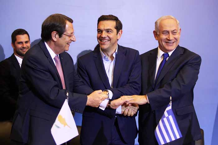 合作 6月15日,在希腊北部城市塞萨洛尼基,希腊总理齐普拉斯(中)、塞浦路斯总统阿纳斯塔夏季斯(左)和以色列总理内塔尼亚胡出席新闻发布会。