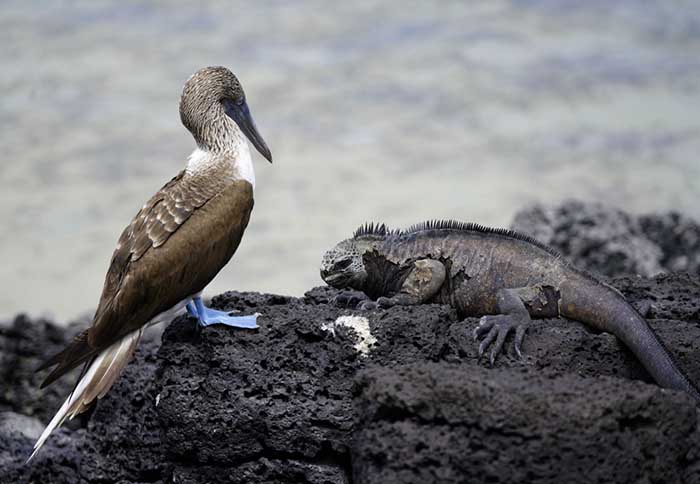 “蓝雨鞋”与“黑怪兽” 这是10月9日在厄瓜多尔加拉帕戈斯群岛的圣克鲁斯岛上拍摄的蓝脚鲣鸟和海鬣蜥。